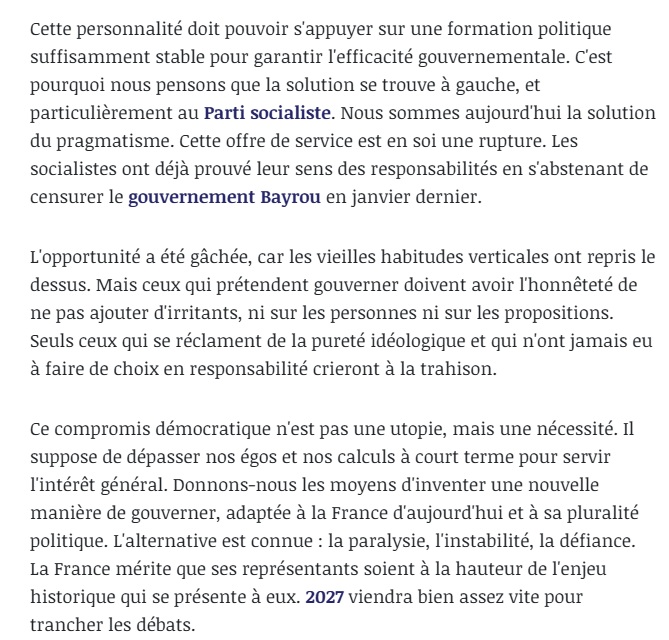 Je refuse l’idée que la France soit condamnée à l’impuissance. Nous avons dix jours pour éviter le chaos. Ces dix jours doivent servir à bâtir un socle commun, fondé sur la justice sociale, la transition écologique, la défense des services publics et le respect de nos institutions.