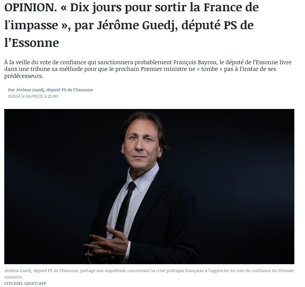 À quelques jours du vote de confiance, la France se trouve dans une impasse politique dangereuse. Le risque est réel : voir tomber un nouveau Premier ministre après ses prédécesseurs. Notre pays n’a pas besoin de cette instabilité répétée, mais d’une respiration démocratique et d’un chemin de sortie clair.